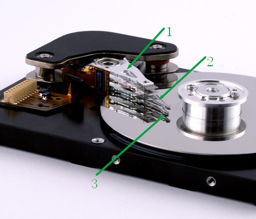 1-硬盤搖臂,2-硬盤折片,3-磁頭
