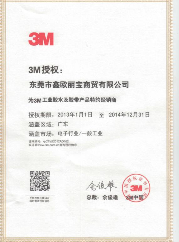 東莞市鑫歐麗寶商貿(mào)有限公司,主要代理世界500強企業(yè),3M公司的膠粘劑產(chǎn)品,F(xiàn)為3M公司特約代理商。在3M公司的大力支持下,目前是華南膠粘劑市場的領(lǐng)導者,并且是3M中國膠粘劑市場的重要合作伙伴(極少數(shù)的VIP經(jīng)銷商之一)。公司擁有1000多平米的辦公場所,3M產(chǎn)品常備庫存多達幾百種型號,供貨實力雄厚,產(chǎn)品價格具有極強的市場競爭。以下是我司的代理證:
