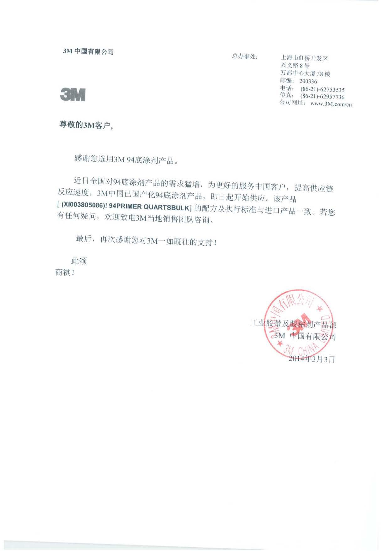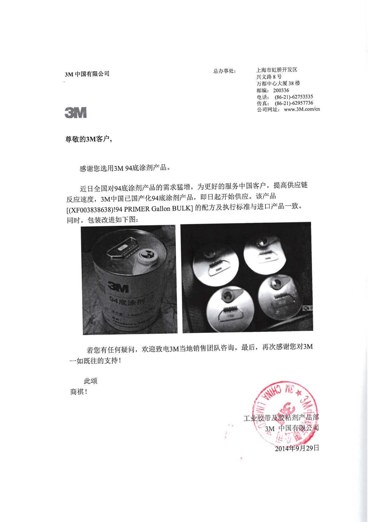 尊敬的用戶: 感謝您選用3M94底涂劑產品。 因全國對3M94底涂劑產品的需求猛增,為了更好的服務中國客戶,提高供應鏈反應速度,3M中國已國產化3M94底涂劑產品,即日起開始供應。該產品的配方及執行標準與進口產品一致,同時包裝改進如下圖:
